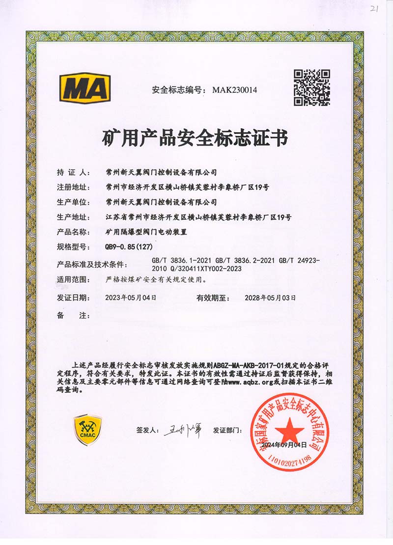 礦用產品安全標志證書QB20-1(380)