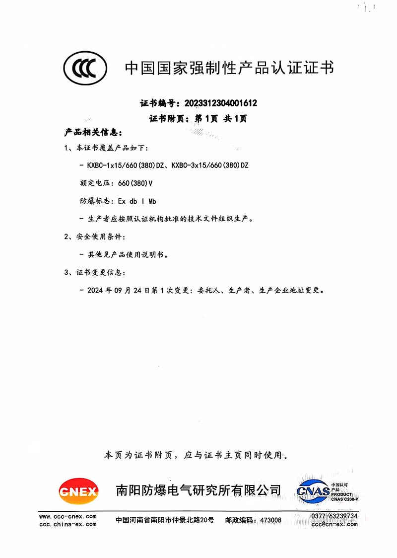 礦用產品安全標志證書KXBC-1 15 660(380)DZ